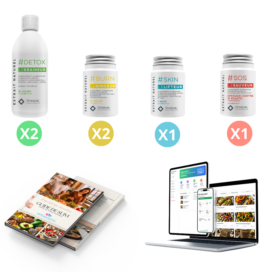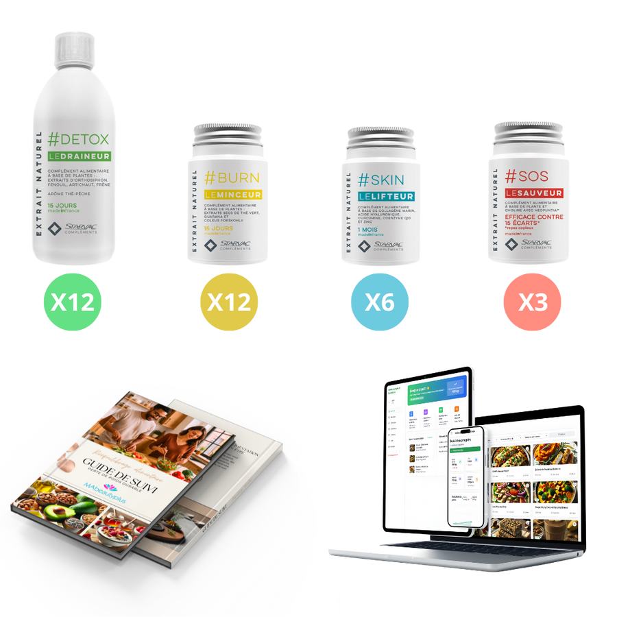- 3 mois de compléments alimentaires adaptés à chaque étape de la cure (détox, combustion, stabilisation...).